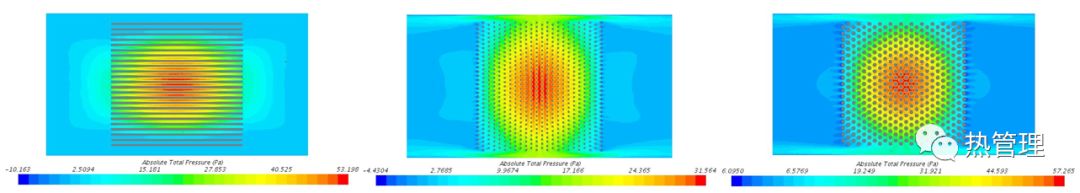 1、肋片式散热器与Pin_fin式型材散热器一(结构同规格),热阻几乎一致(pin_fin式散热器虽然紊流度增加,但翅片换热面积减少),pin_fin式散热器流阻更小,达到35.3%;